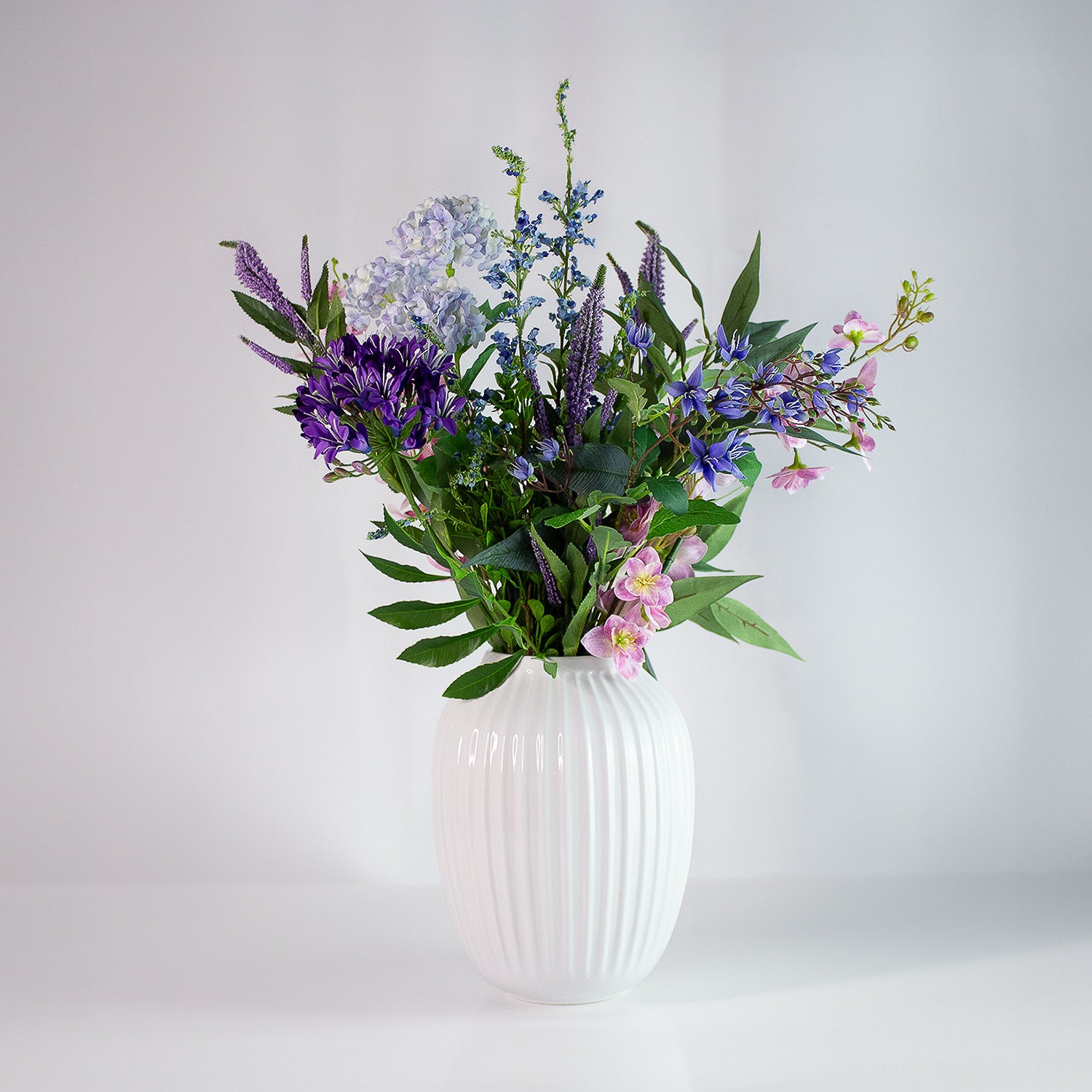 Bluebell Serenade is an elegant bouquet that brings harmonious shades of blue and purple into your home. With lifelike artificial flowers such as sage, umbels, cherry blossoms, eucalyptus and snowball hydrangea, this bouquet creates an enchanting and sophisticated expression. Perfect for adding a touch of tranquility and color to your home decor, while staying beautiful forever. A timeless decoration with a focus on detail and quality.
