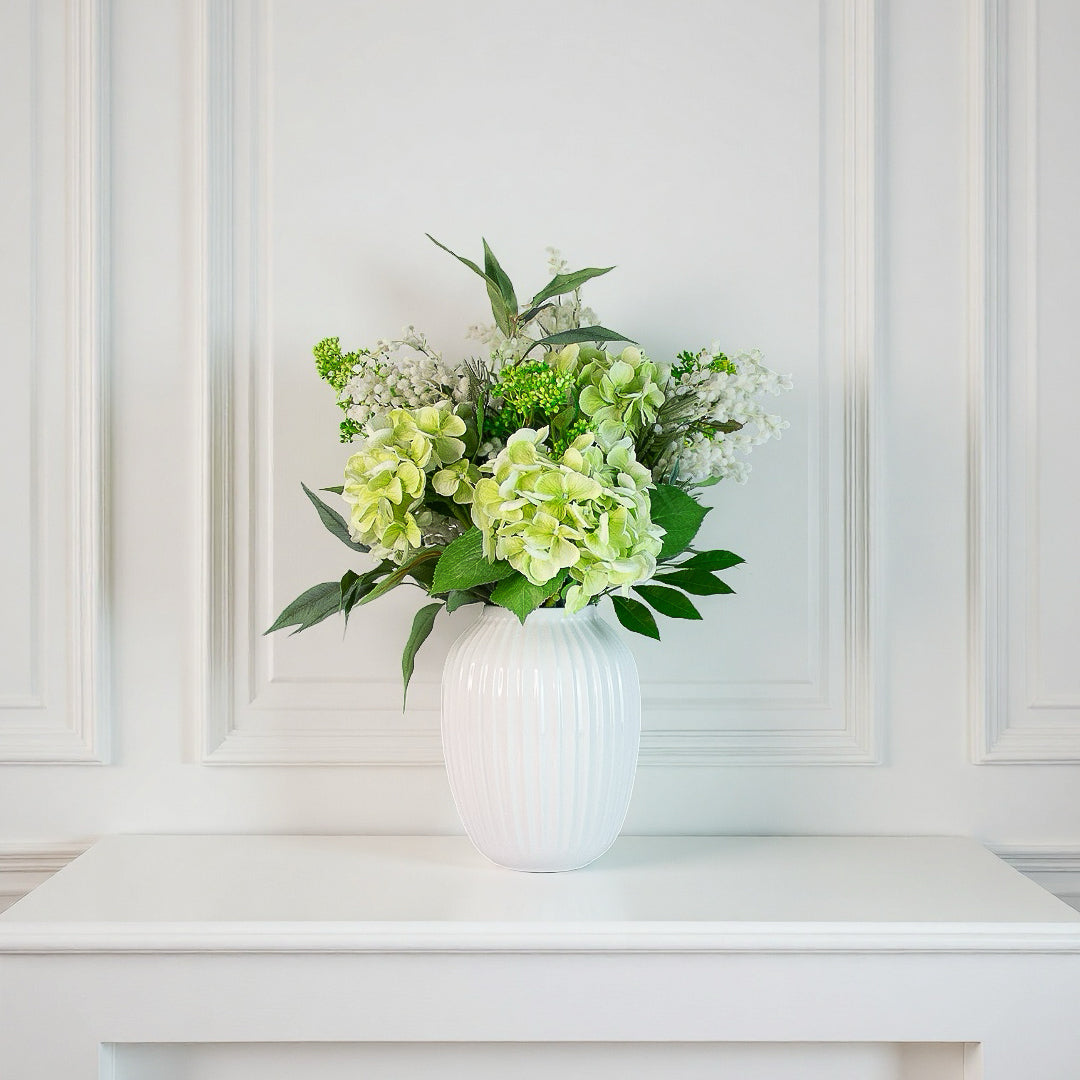 Forest Glow is a beautiful, handmade bouquet in shades of green and white that exudes elegance and the freshness of nature. It consists of artificial detailed hydrangeas, mimosa flowers, elderberry flowers and lush green eucalyptus, perfectly composed to create a timeless and stylish decoration for your home.