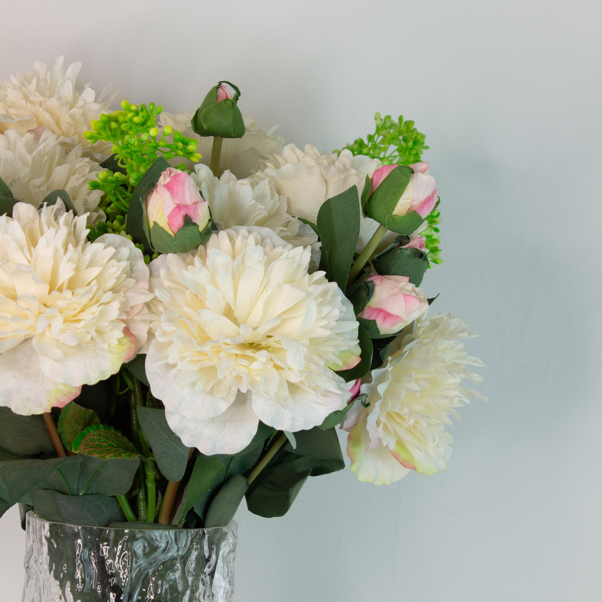 The Ivory Garden bouquet is designed to bring calm and elegance into your home. The soft, creamy peonies combined with delicate elderberry flowers create a harmonious and luxurious expression. The green leaves add a fresh and natural touch, making the bouquet perfect for any decor.