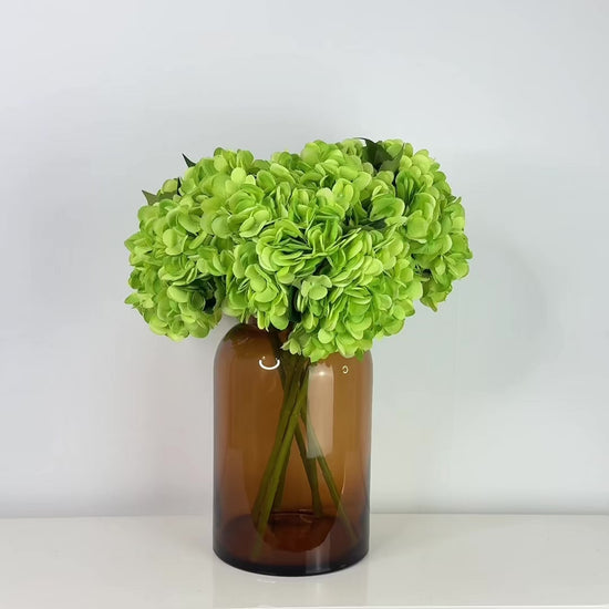 Lime green hydrangea is a handmade , lifelike artificial bouquet in bright lime green, which brings fresh energy and light into the room. The large, voluminous heads give a calm and elegant expression - perfect as a decoration on the dining table, in the living room or hallway.