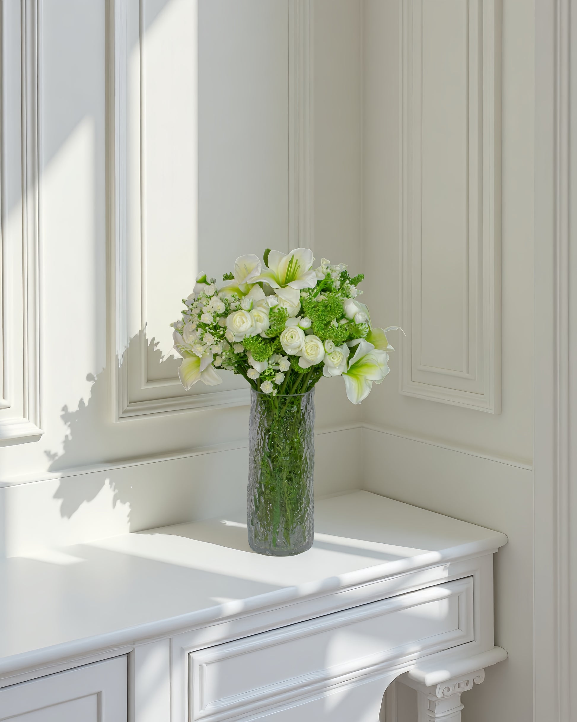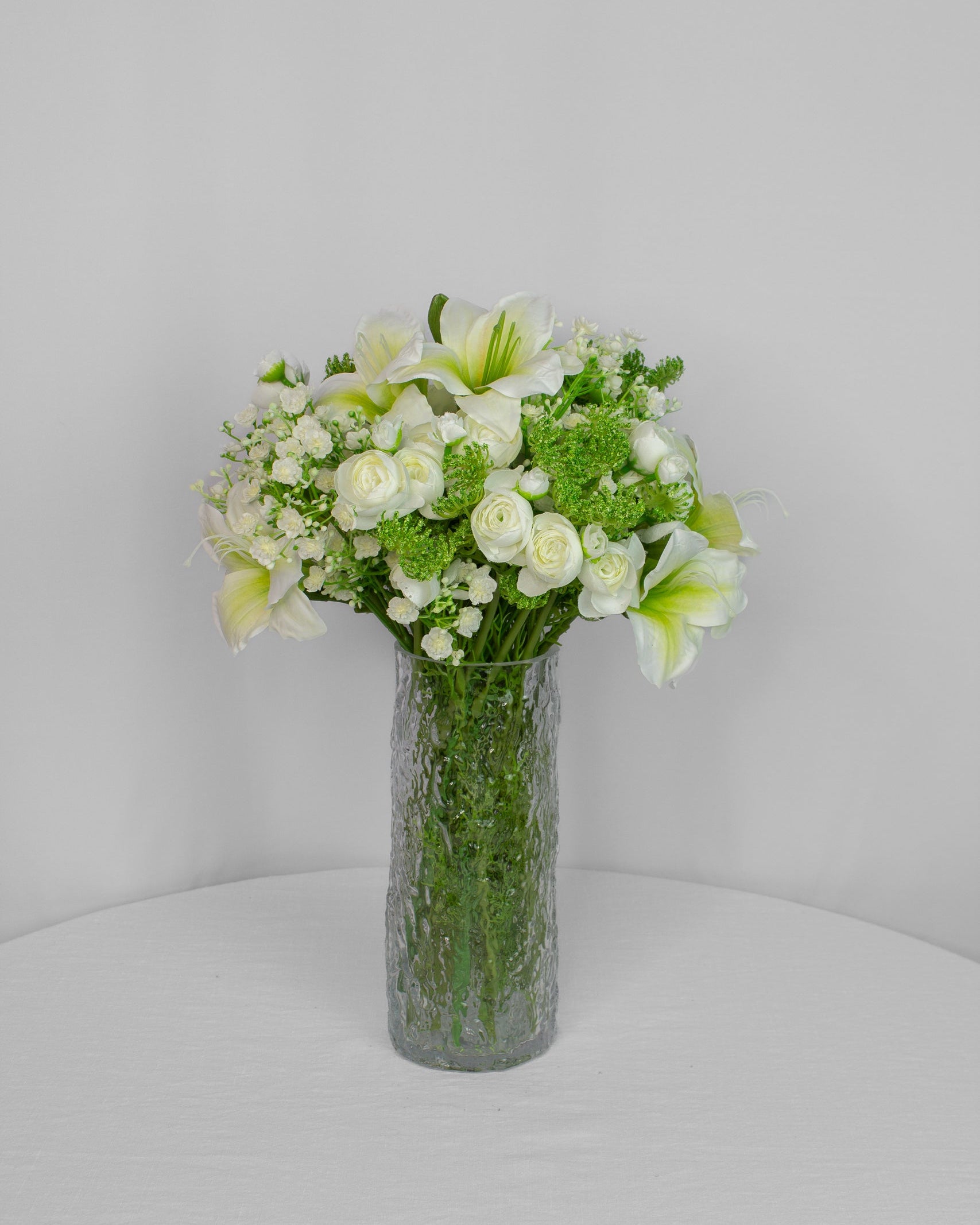 Nordic Spire er en håndlavet, naturtro kunstig buket i friske grønne og bløde hvide toner. Mini-ranunkler og let brudeslør skaber et luftigt, nordisk udtryk, mens dagliljer og grønne frøstande giver struktur og dybde. Perfekt som elegant statement i entréen, på spisebordet eller i stuen.