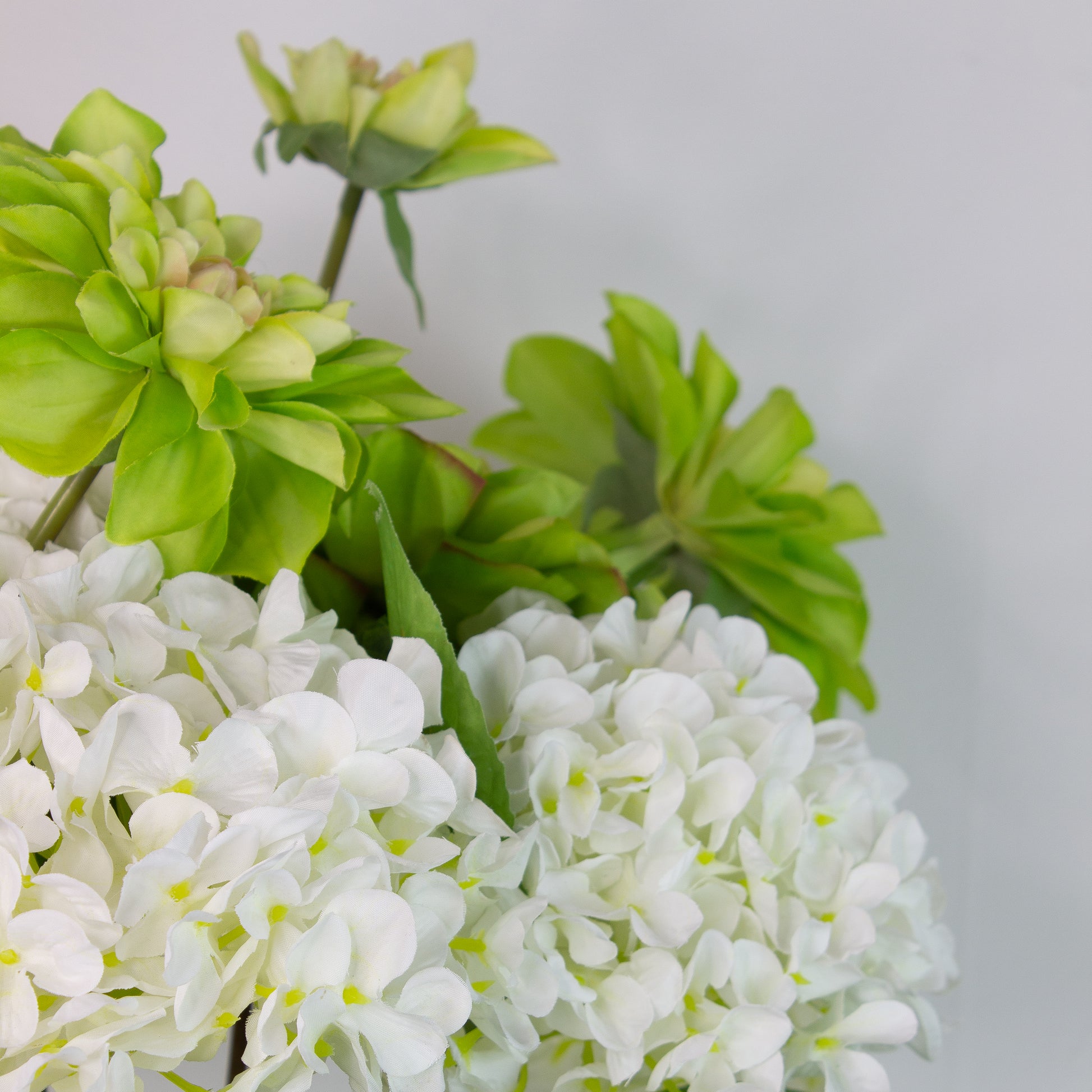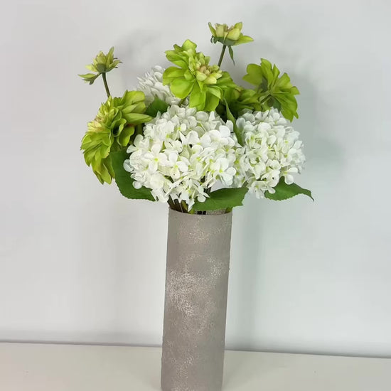 Elegant Bloom er en sofistikeret buket, der kombinerer smukke dahlia-blomster og naturtro hortensiaer i harmoniske nuancer. Perfekt til dig, der ønsker et tidløst og stilfuldt udtryk i din boligindretning.