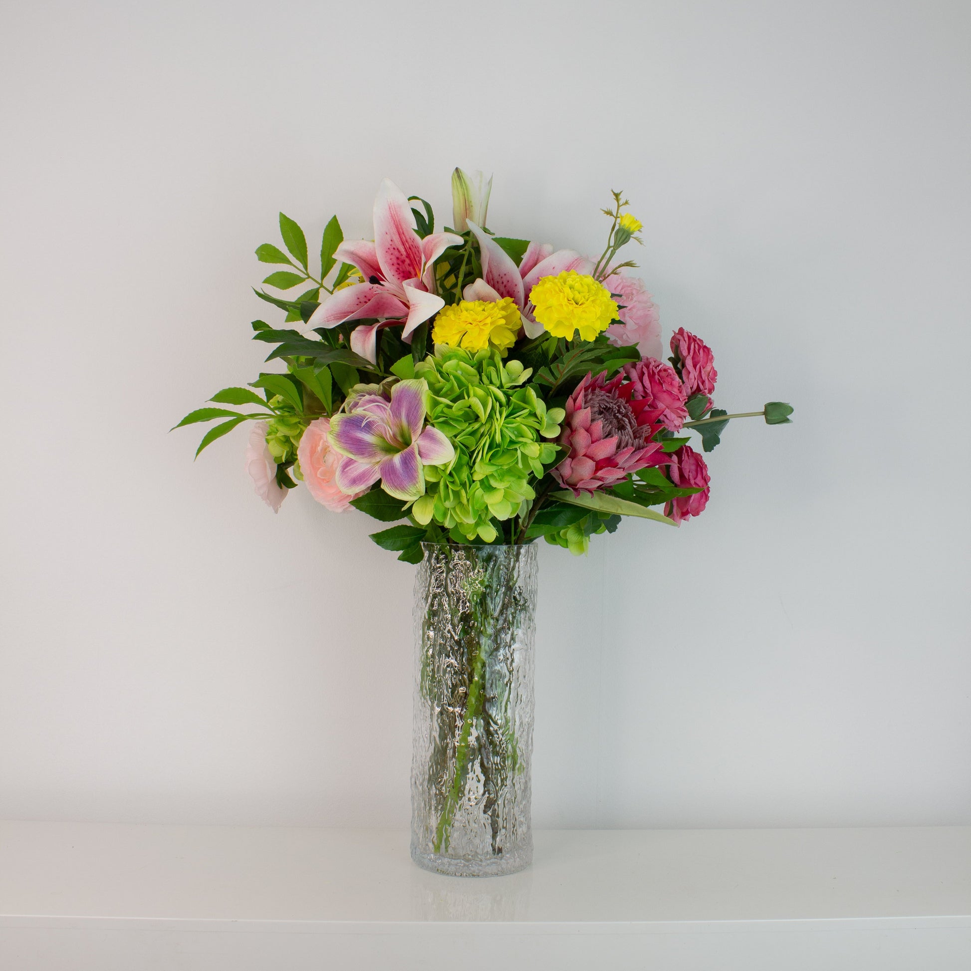 Garden Fiesta er en livlig buket fyldt med håndlavede, kunstige blomster i sprudlende farver fra limegrøn hortensia og gule marigold til pink ranunkler, liljer og majestætisk protea. Sammensætningen giver et varmt, festligt udtryk med masser af dybde og kontrast, der lyser ethvert rum op. Perfekt som midtpunkt på spisebordet eller som glad velkomst i entréen.